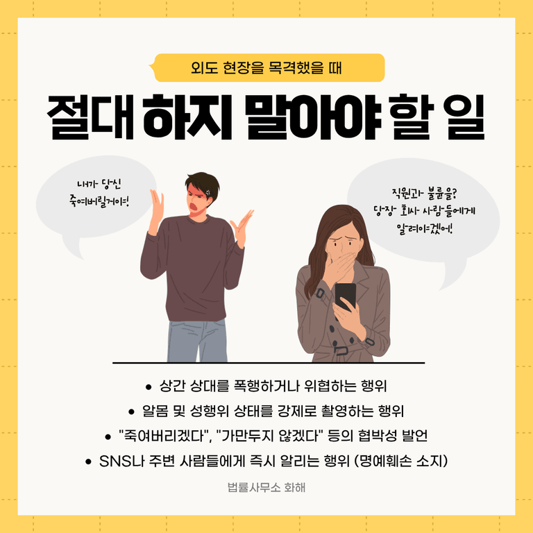 사실 이런 상황에서 아내 입장에서는 분노를 느끼고 충격을 받는 것이 당연합니다. 하지만 중요한 점은, 배우자의 외도 현장을 직접 목격한 사실만으로 이러한 범죄 성립이 면책되는 것은 아니라는 것입니다. 법원에서는 ‘정당한 분노’와 ‘불법행위’를 엄격하게 구분하고 판단합니다. 감정적 동요가 있었다 하더라도 법적으로 허용되는 범위를 넘어선 행위라면 처벌을 받을 수 있으므로 신중한 대응이 필요합니다.