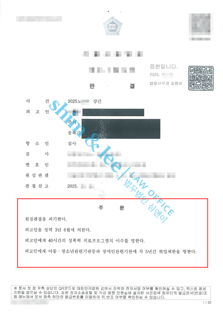 -그 결과 항소심에서는 가해자에게 징역 3년 6월, 성폭력 치료강의 40시간, 취업제한 5년이라는 엄중한 선고가 내려졌습니다.