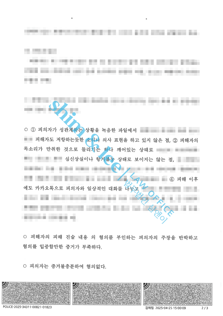 심앤이는 가해자가 제출한 증거조차 피해자 진술의 신빙성을 뒷받침하고 있음에도, ‘저항하지 않았다’고 판단한 것은 수사기관의 명백한 사실오인이라고 강하게 지적했습니다.