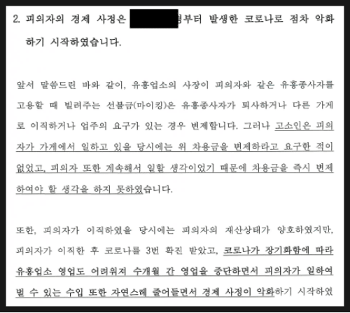 이후, 의뢰인은 ‘무지개’에서 일하며 고객 결제금 중 ‘주대(술값)’의 58%를 본인 몫, 42%를 고소인 몫으로 정산하 구조로 근무했습니다. 그러나 코로나 시기 이후 매출이 급감하고, 고객 외상금 회수가 어려워지면서 정산이 밀리기 시작했습니다.