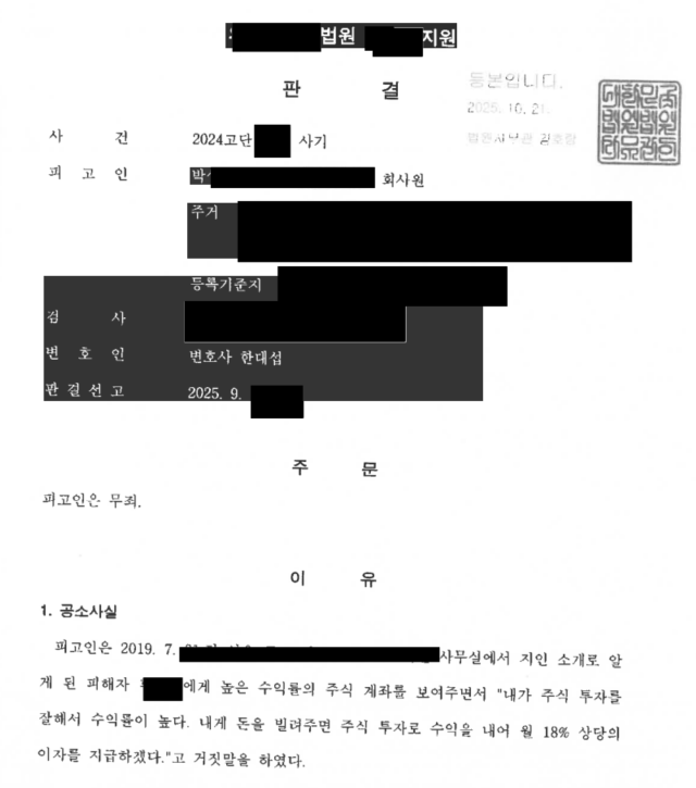 하지만 ① 피해자 진술의 모순을 탄핵하고, ② '돌려막기'가 아닌 '실제 투자'를 했음을 객관적 자료로 증명하며, ③ 검찰이 '기망행위'를 구체적으로 입증하지 못함을 밝혀냄으로써 '무죄'라는 값진 결과를 얻어낼 수 있었습니다.