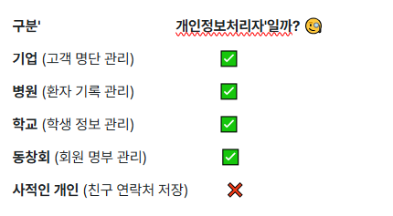 즉, 보호법은 기본적으로 영리적이든 비영리적이든 '조직적/지속적 활동(업무)'의 일환으로 개인정보를 다루는 주체에게 무거운 의무와 책임을 지우는 법입니다.