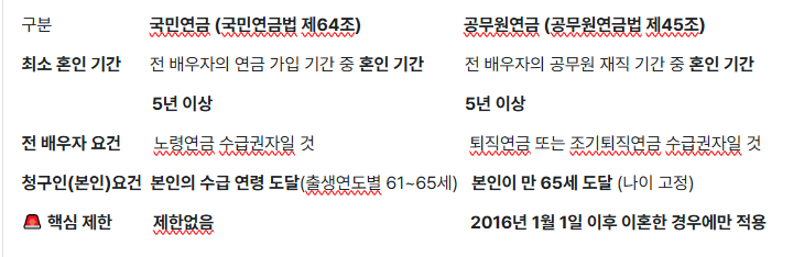 분할연금은 이혼 직후가 아니라, 본인 나이(61~65세)가 되고 전 배우자가 연금을 타기 시작하는 등 모든 요건이 충족되어야 받을 수 있습니다. 수십 년이 걸릴 수도 있죠.