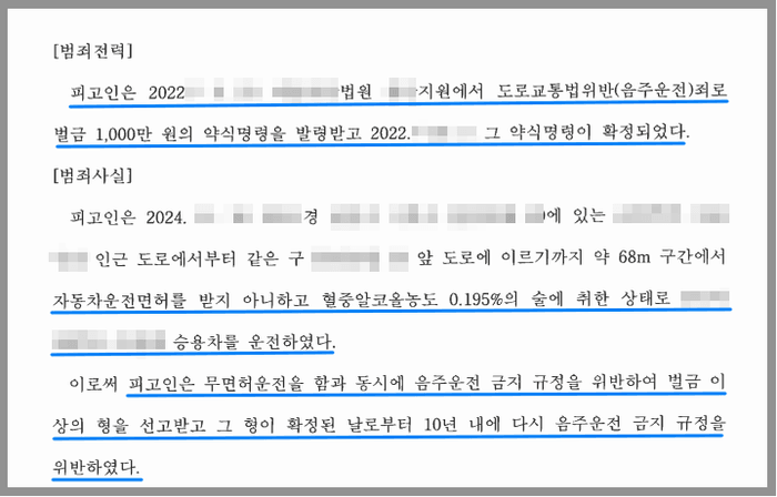 그런데 Y는 약 2년 전 술에 취한 상태로 운전을 하다가 대인피해가 있는 사고를 내어 도로교통법위반(음주운전)죄 및 특정범죄가중처벌등에관한법률위반(위험운전치상)죄로 벌금형의 처벌을 받은 전력이 있었고, 해당 전력으로 인해 면허도 취소된 상태였습니다.