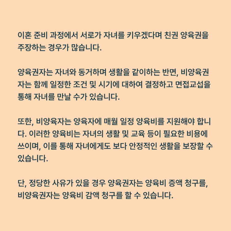 하지만 비양육권자는 함께 양육이 불가능하기 때문에 일정한 조건 및 시기에 대하여 결정하고 면접교섭을 통해 자녀를 만날 수가 있습니다. 또한 비양육자는 양육자에 비해서 부담이 적은 것이 사실이며, 자녀에 대한 의무를 다하지 못하기 때문에 이를 대체하기 위해 금전적으로 지원을 하게 됩니다.