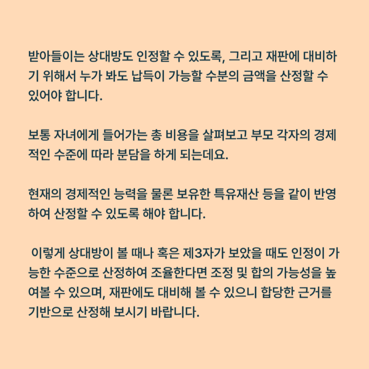 받아들이는 상대방도 인정할 수 있도록, 그리고 재판에 대비하기 위해서 누가 봐도 납득이 가능할 수분의 금액을 산정할 수 있어야 합니다. 보통 자녀에게 들어가는 총 비용을 살펴보고 부모 각자의 경제적인 수준에 따라 분담을 하게 되는데요.