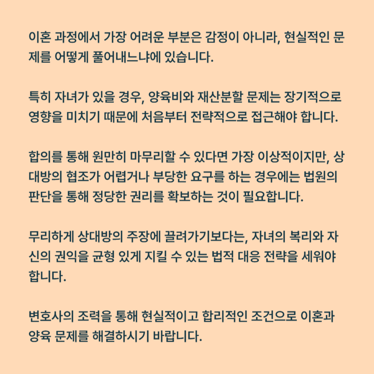 이혼 과정에서 가장 어려운 부분은 감정이 아니라, 현실적인 문제를 어떻게 풀어내느냐에 있습니다. 특히 자녀가 있을 경우, 양육비와 재산분할 문제는 장기적으로 영향을 미치기 때문에 처음부터 전략적으로 접근해야 합니다.