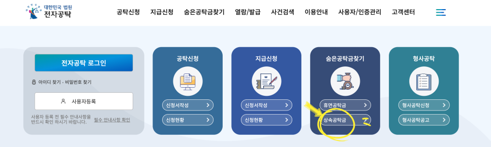 홈페이지 우측 상단에 상속공탁금 란을 클릭하신 후 신청인과 피상속인의 성명 및 주민등록번호 등 인적사항을 입력하고 가족관계등록정보 이용 동의, 후 공동인증서 등을 이용하여 상속인의 본인 인증을 하면 됩니다.