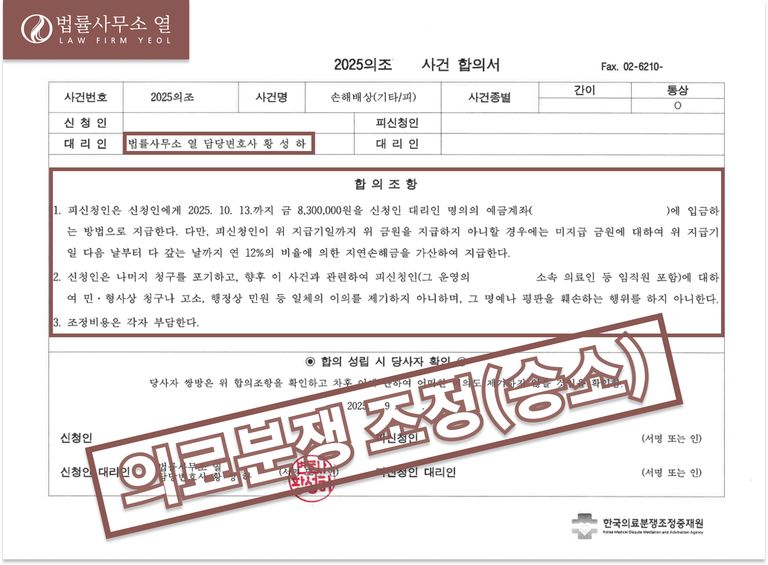 조정위원들과 상대방 의원은 모두 300만 원 정도의 합의금이 적당하다는 의견을 내었으나, 황성하 변호사는 향후치료비 및 치료 후에도 남을 수 있는 흉터를 지적하며 합의가 안되면 민사소송도 불사한다는 자세로 합의금을 높이기 위하여 노력하였고, 결국 금 830만 원에 합의가 이루어졌습니다. 합의서 작성 이후 의뢰인은 합의금을 곧 지급 받음으로써 오랜 기간 고통받은 사건을 만족스럽게 일단락할 수 있었습니다.