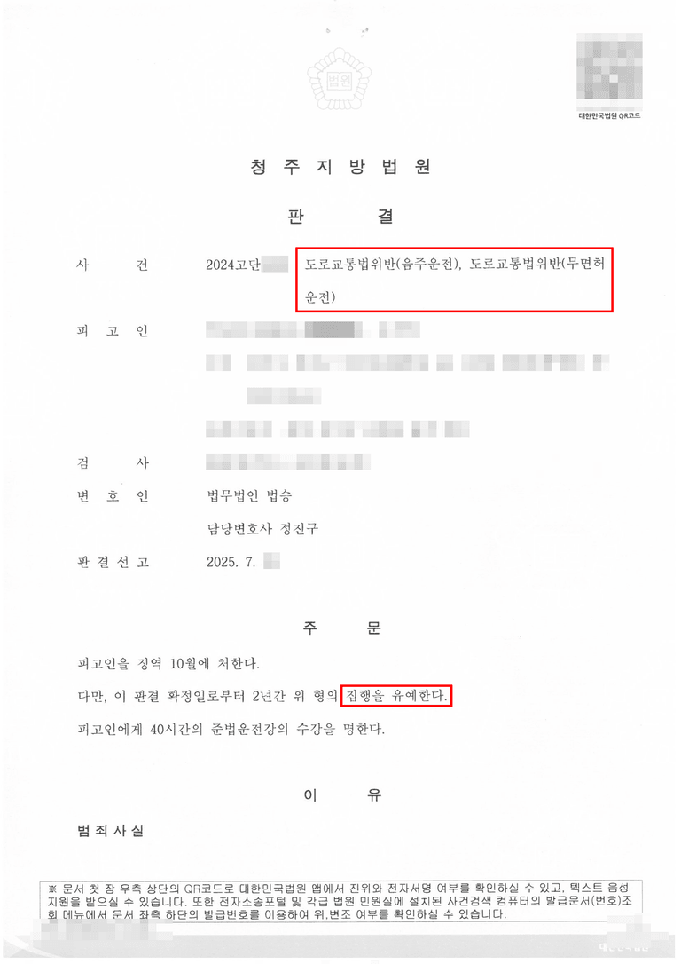 청주형사전문변호사의 적극적인 변호를 통하여 결국 집행유예를 받으며 실형을 면할수 있었습니다.