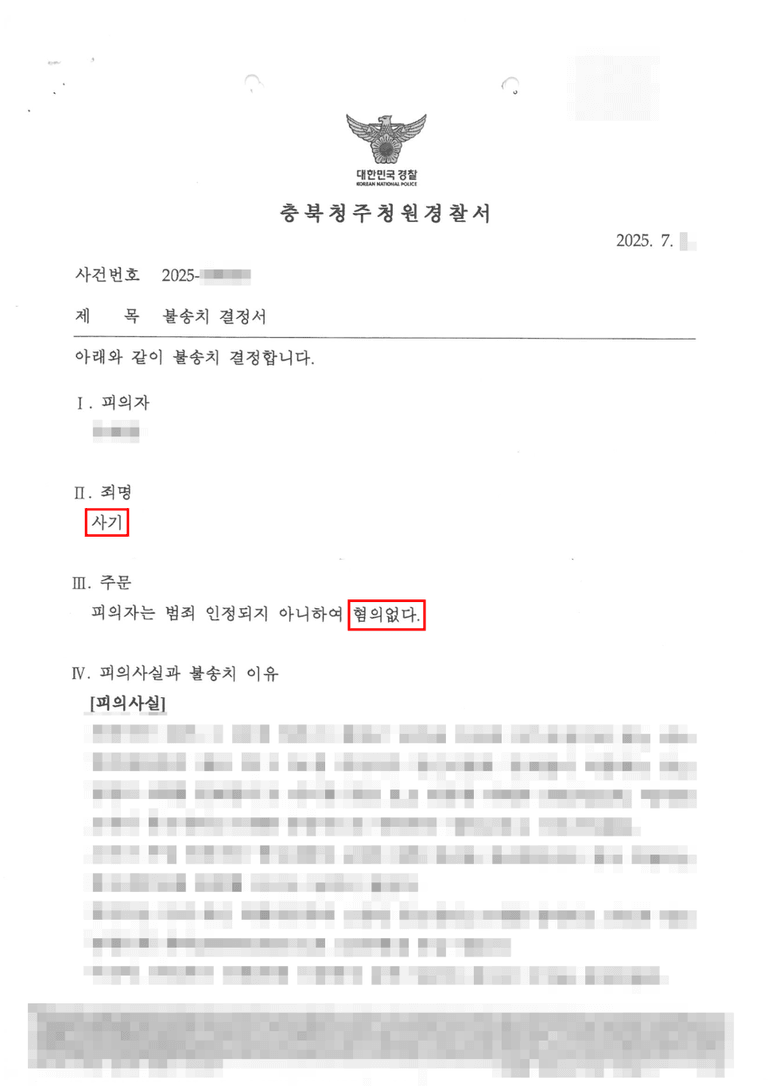 이 세 가지를 입증하여 무혐의 불송치 결정을 받아냈습니다.