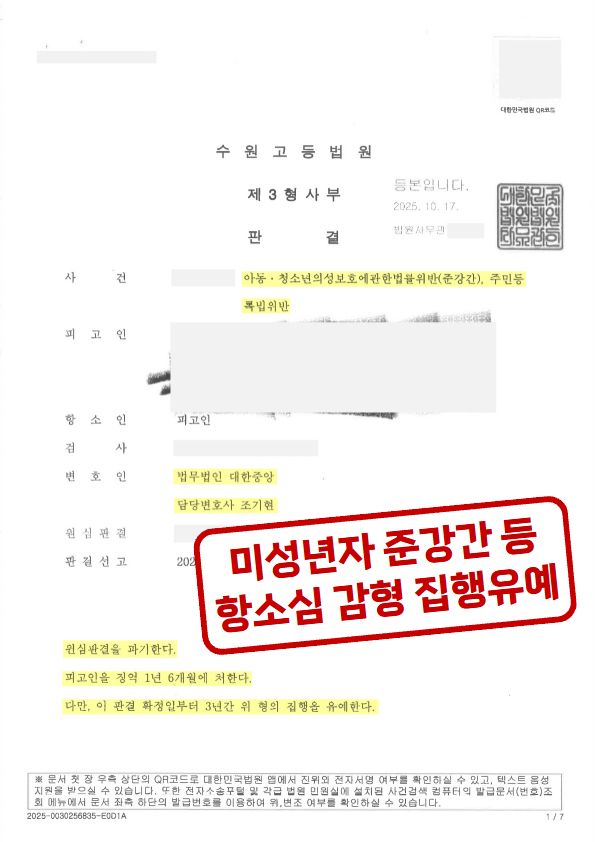 이에 A군은 소년부 송치가 아닌 형사사건으로 기소되었고 장기 2년, 단기 1년 3개월의 징역형을 선고받았습니다. 이에 A군과 부모님은 항소하기 위해 항소사건에 경험이 많은 소년법전문변호사인 조기현 변호사를 찾아주셨습니다.