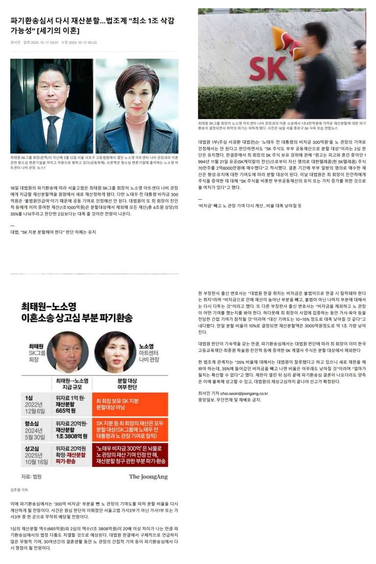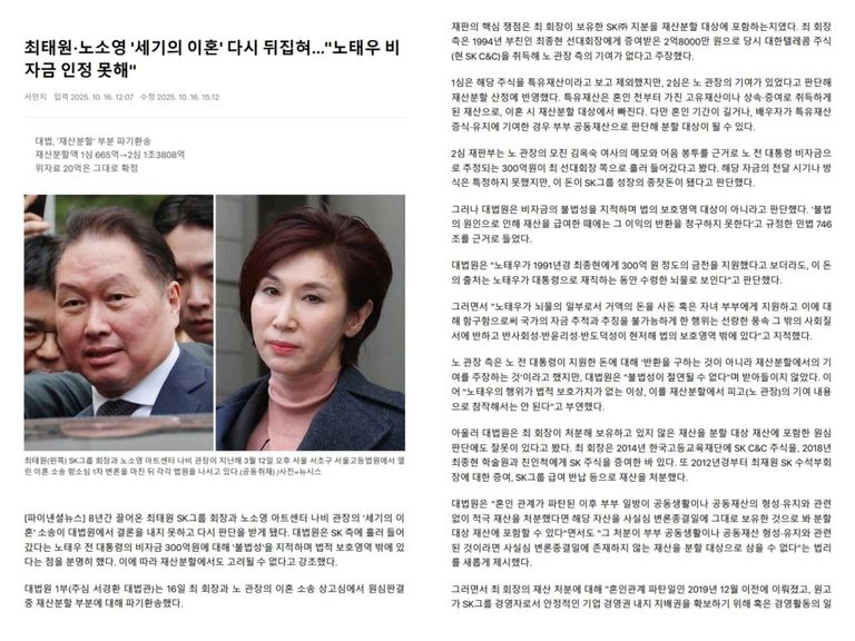 우리나라에서는 세기의 이혼이라 불리는 SK그룹 최태원 회장과 배우자 노소영 관장의 이혼이 제1심 판결에서부터 세간의 큰 관심을 받아왔고 2025. 10. 16. 대법원 판결이 있었습니다.