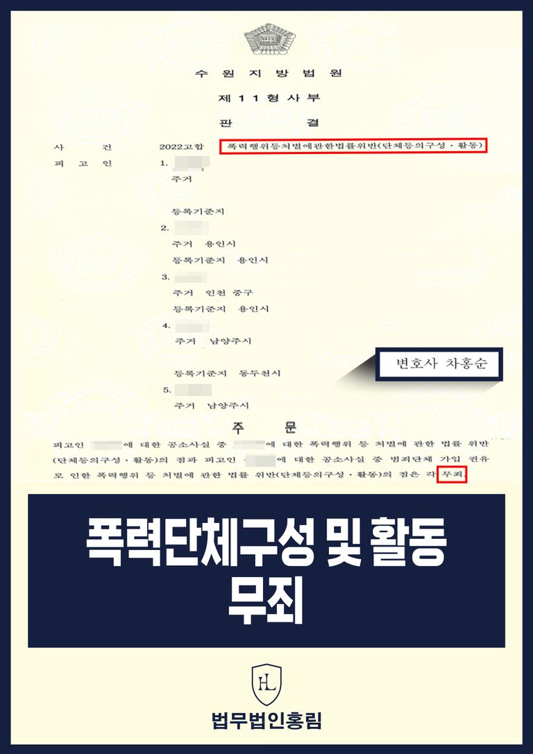 그 결과, 재판부는 피고인들에게 적용된 폭력단체 구성 및 활동 혐의 전부에 대해 무죄를 선고하였습니다. 실형이 불가피했던 중대한 폭력 조직 관련 혐의에서 벗어난 의뢰인들은 법무법인 홍림의 조력을 통해 억울함을 해소하고 자유를 회복하며 성공적인 재기를 위한 기회를 얻을 수 있었습니다.