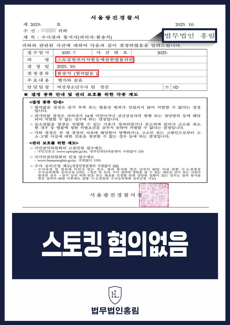경찰은 법무법인 홍림 변호인의 치밀한 법리 분석과 증거 자료(통화 기록 등)를 전적으로 받아들인 결과, 경찰은 의뢰인에게 적용된 스토킹처벌법 위반 혐의에 대해 '범죄 혐의가 인정되지 않는다'고 판단하여 불송치(혐의없음) 결정을 내렸습니다.