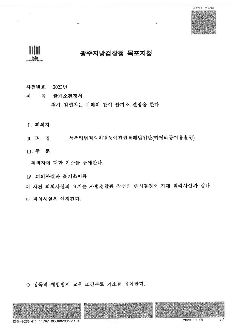 검찰은 재범위험이 낮고 피해회복이 이뤄진 점을 받아들여 교육이수조건부 기소유예 처분을 했습니다.