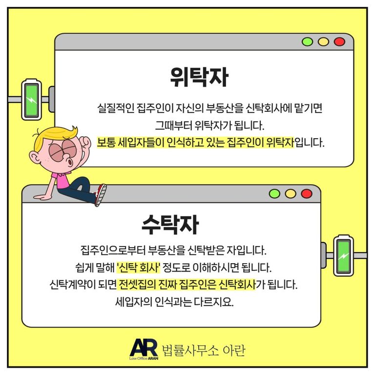 수탁자 : 집주인으로부터 부동산을 신탁받은 자입니다. 쉽게 말하면 '신탁 회사' 정도로 이해하시면 됩니다. 신탁계약이 되면 전셋집의 진짜 집주인은 신탁회사가 됩니다. 세입자의 인식과는 다르지요.