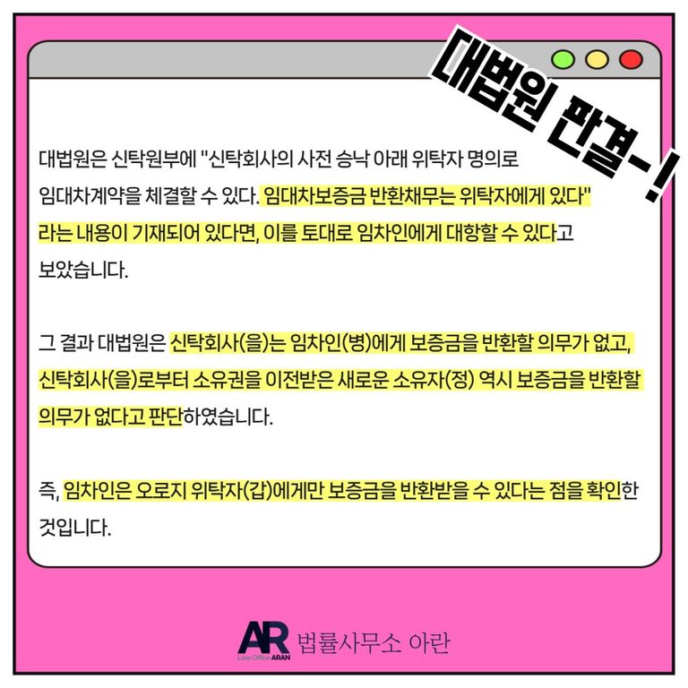 즉, 임차인은 오로지 위탁자(갑)에게만 보증금을 반환받을 수 있다는 점을 확인한 것입니다.