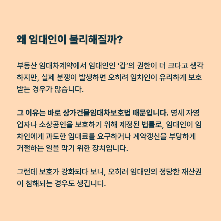 그 이유는 바로 상가건물임대차보호법 때문입니다. 이 법은 영세 자영업자나 소상공인을 보호하기 위해 제정된 법률로, 임대인이 임차인에게 과도한 임대료를 요구하거나 계약갱신을 부당하게 거절하는 일을 막기 위한 장치입니다.