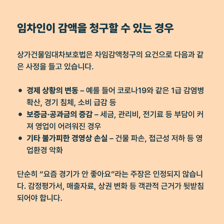 임차인은 반대로 매출이 급감하거나 경기침체 등으로 부담이 과중할 때 인하를 요구할 수 있습니다.