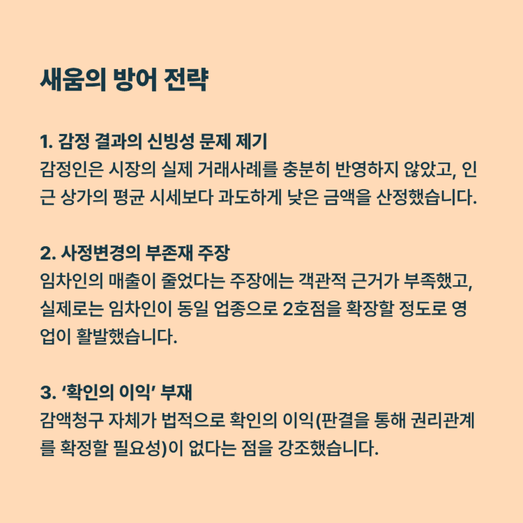 특히 감액청구가 기각될 경우, 소송비용을 상대방이 부담하게 되어 오히려 임대인이 피해를 줄일 수도 있습니다.