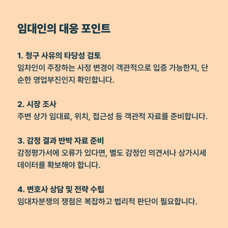 – 임차인이 주장하는 사정변경이 객관적으로 입증 가능한지, 단순한 영업부진인지 확인합니다.