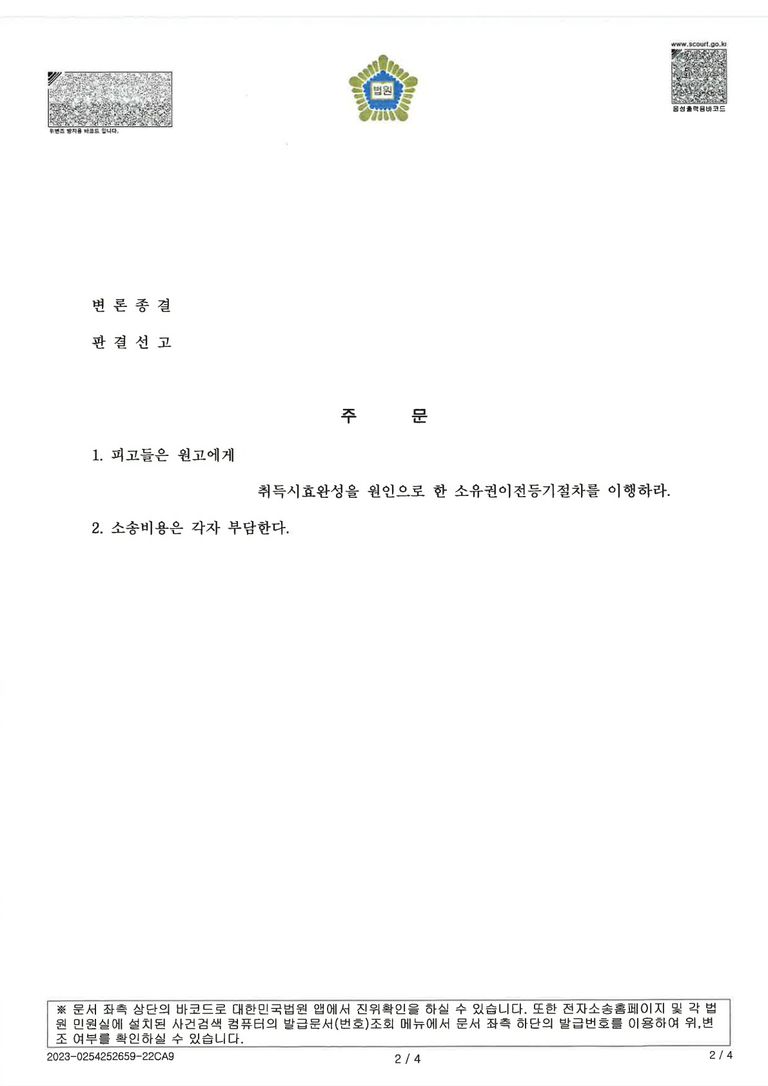 법원은 A씨가 쟁점 토지를 주택 마당으로 소유의 의사 아래 평온·공연하게 20년 이상 점유한 사실을 인정했습니다. 그 결과, 취득시효 완성을 원인으로 한 소유권이전등기 청구를 인용했고, 피고들은 해당 지분 범위에 관해 이전등기 절차를 이행하라는 판결이 선고되었습니다.