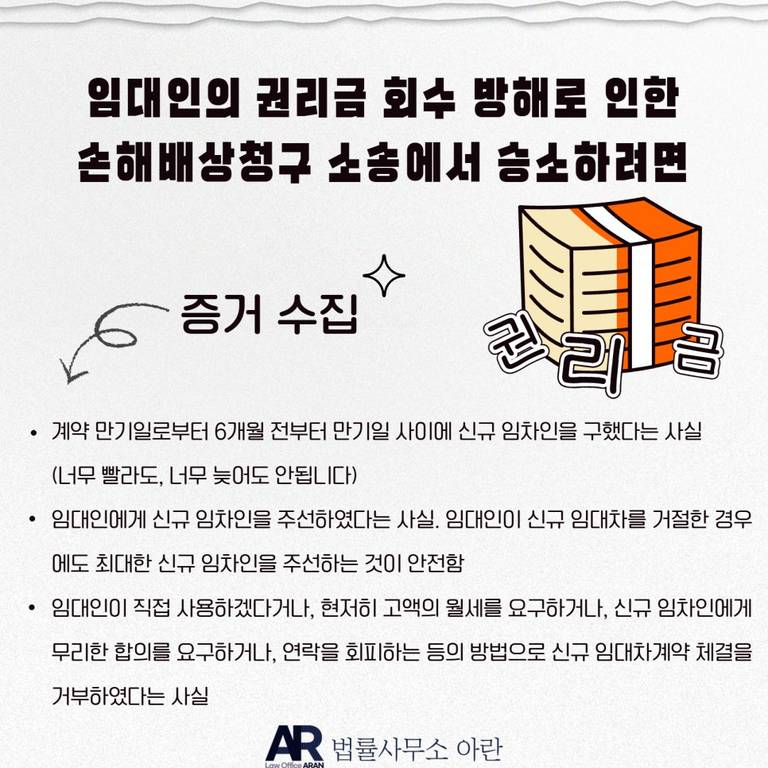 임대인의 권리금 회수 방해로 인한 손해배상청구 소송에서 승소하려면 아래의 사항에 대한 증거를 잘 수집하셔야 합니다.