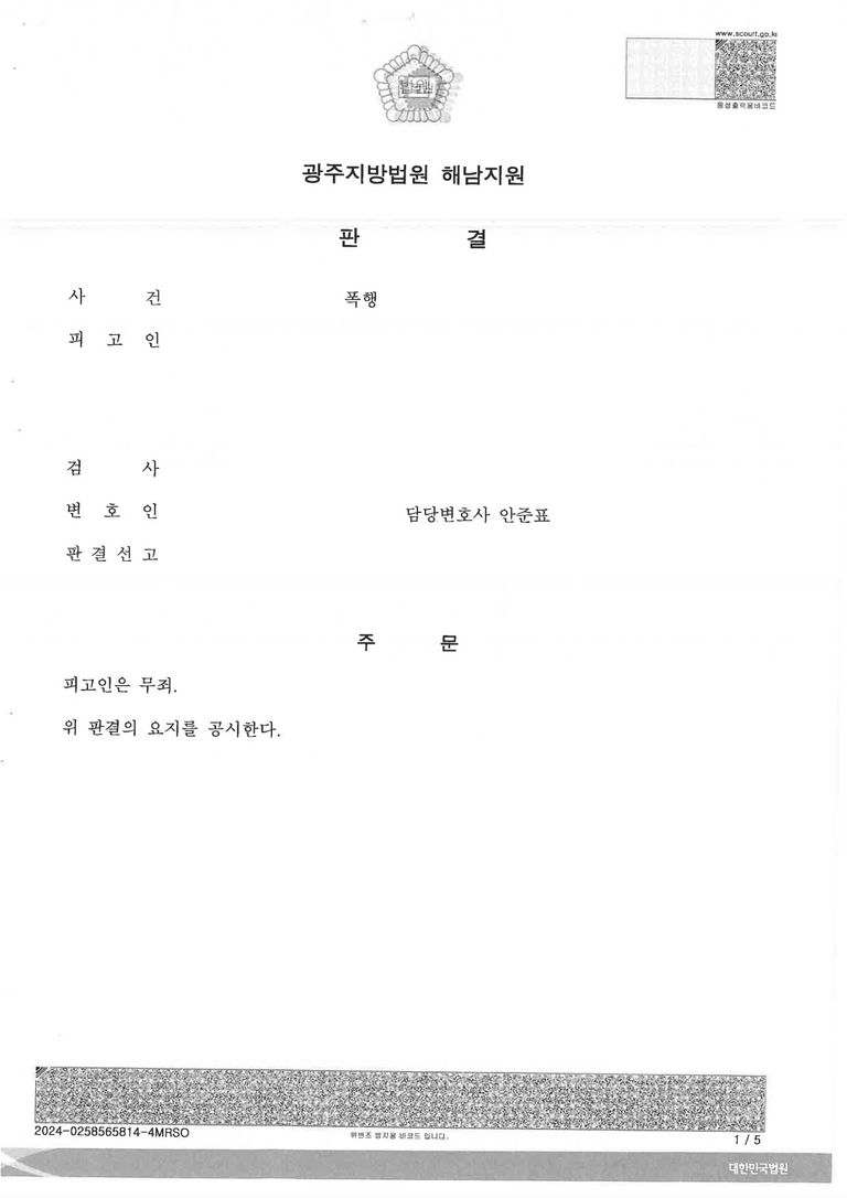목격자 진술 역시 폭행 장면을 명확히 본 사람이 없어, 범죄의 증명이 부족하다며 형사소송법 제325조 후단에 따라 무죄를 선고했습니다.