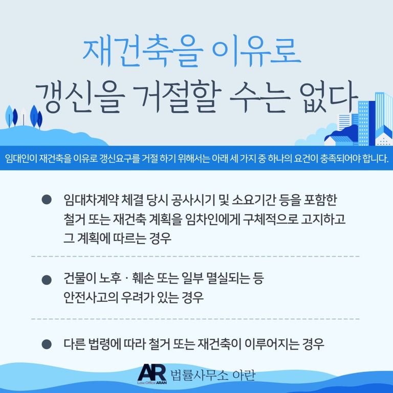 임대인이 단순히 재건축을 한다는 이유만으로는 갱신을 거절할 수 없지만, 아래 세 가지 중 하나의 요건이 충족되었다면 그때는 재건축을 이유로 갱신요구를 거절할 수 있습니다.