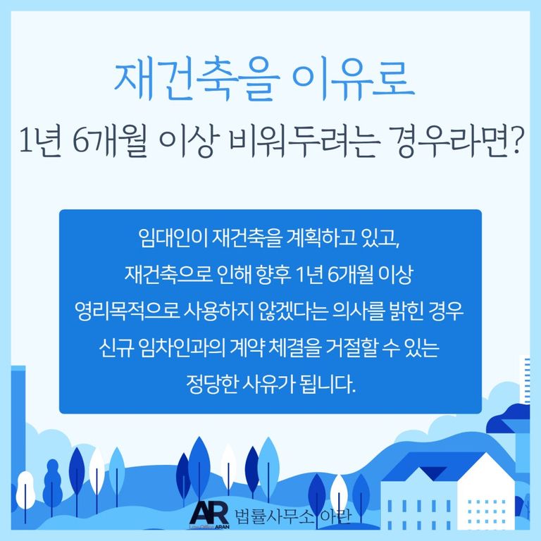 단, 재건축을 이유로 1년 6개월 이상 비워두려는 경우라면, 신규 임차인과의 계약 체결을 거절할 수 있습니다.