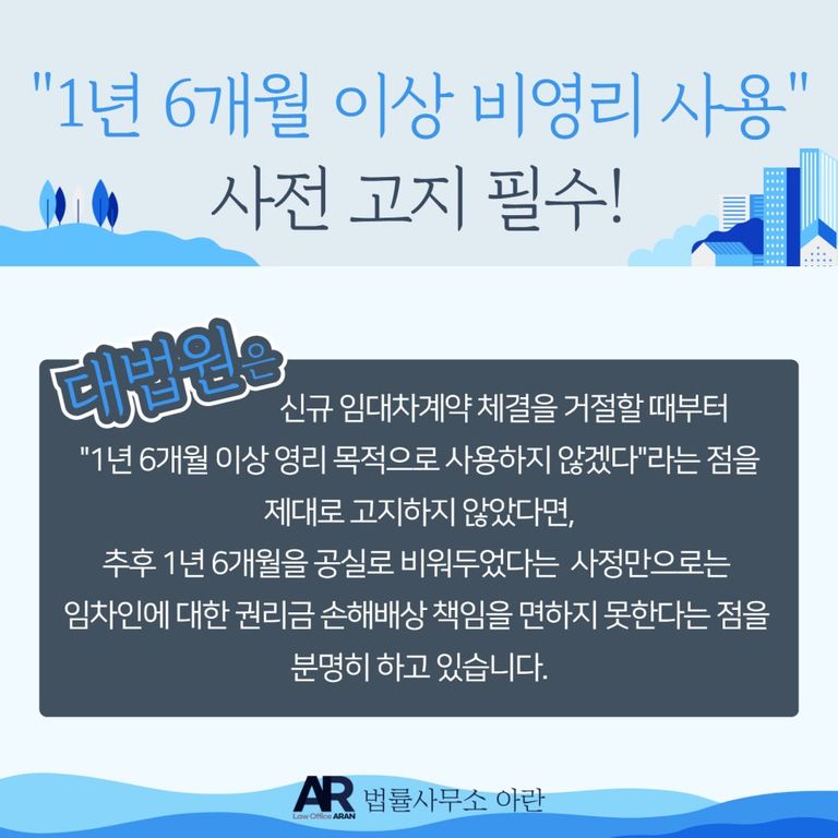 실제로 대법원 2021. 11. 25. 선고 2019다285257 판결은 "임대인이 다른 사유로 신규 임대차계약 체결을 거절한 후 사후적으로 1년 6개월 동안 상가건물을 영리목적으로 사용하지 않았다는 사정만으로는 위 조항에 따른 정당한 사유로 인정할 수 없다."라는 점을 명확하게 선언하고 있습니다.