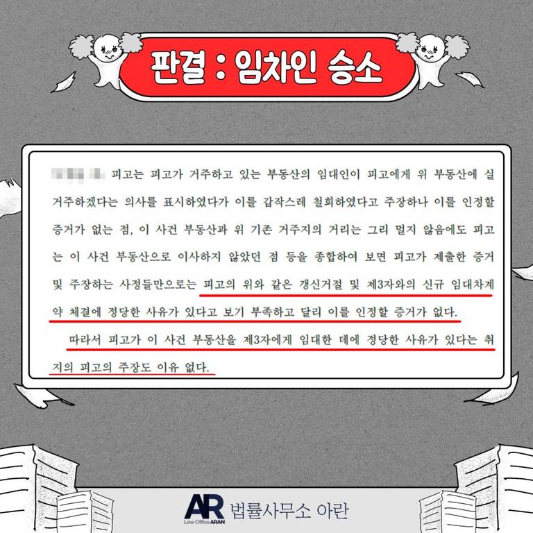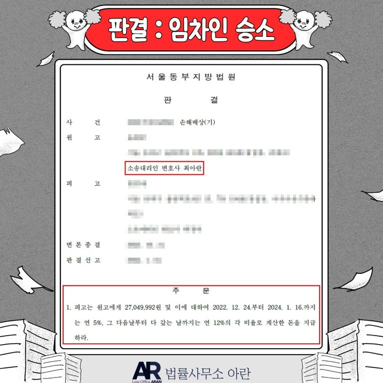 즉, 세입자(의뢰인)이 승소하였습니다. 이후 임대인은 1심 판결에 불복하여 항소하였으나, 항소심에서도 마찬가지로 세입자 승소 판결이 선고되었습니다.