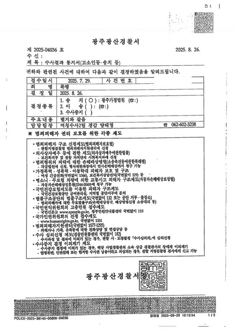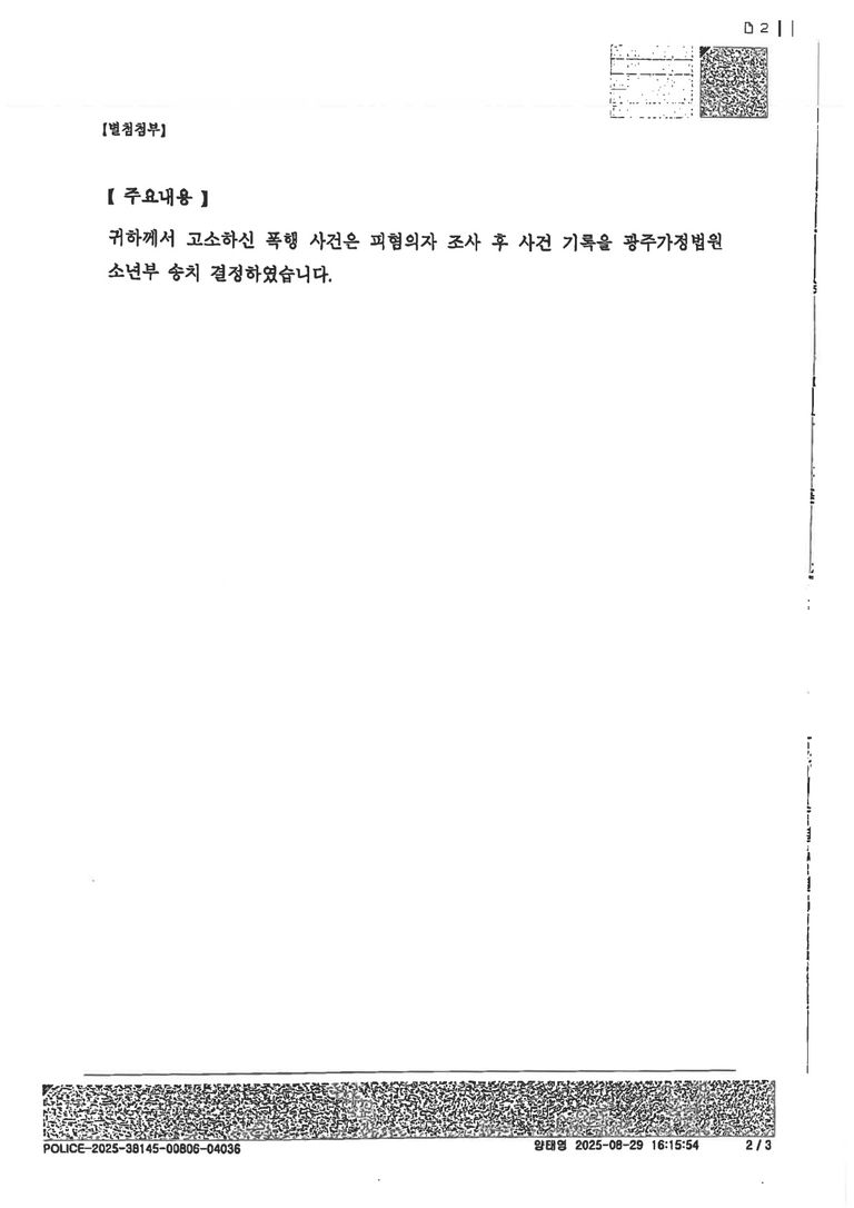 경찰은 피혐의자 조사 후 사건을 광주가정법원 소년부로 송치했습니다. 이는 학폭위 단계에서 무혐의에 가까웠던 사건이라도, 형사절차에서 체계적으로 증거를 재구성하면 처분이 달라질 수 있음을 보여줍니다.