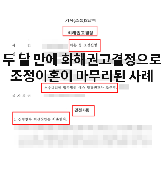 조정이혼에 대해 문의주시는 분들이 꾸준히 있는 편인데요. 오늘은 조정이혼을 신청한지 두 달 만에 화해권고결정으로 사건이 마무리된 사례를 소개해드리겠습니다.