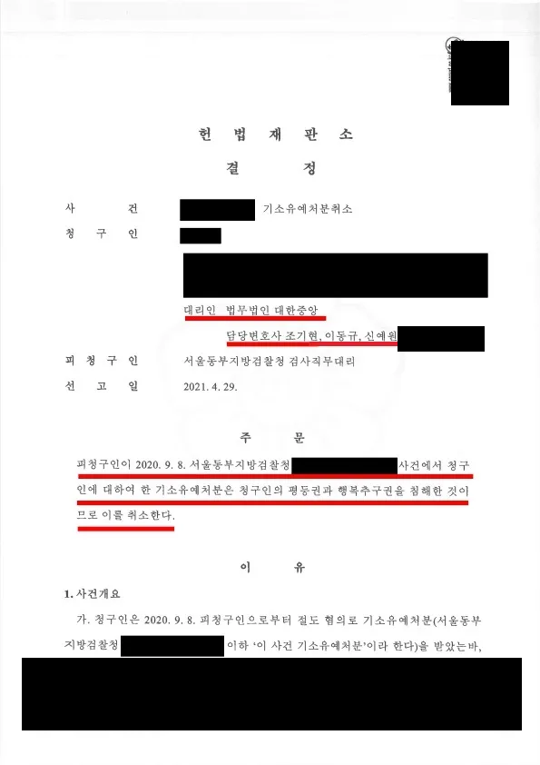 헌법재판소는 조기현 변호사의 주장을 받아들여 의뢰인에게 내려진 검사의 기소유예처분을 취소하는 결정을 하였습니다.
