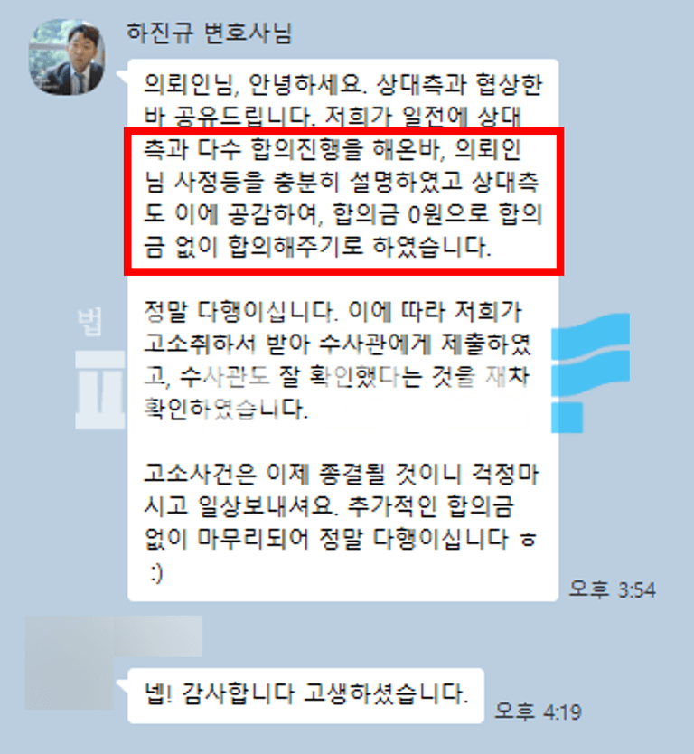 의뢰인은 변호인과의 충분한 상담을 통해 조사 진행 전 합의를 진행하여 사건을 마무리 짓는 방향으로 나아가길 희망하였습니다.