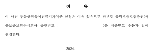 재판부에서는 변호사가 작성한 점유이전금지가처분신청서의 내용을 검토한 다음, 그 소명이 충분하다고 판단하여 보증보험계약에 기한 보증보험증권으로 담보를 제공하는 조건으로 가처분을 인용하였습니다.