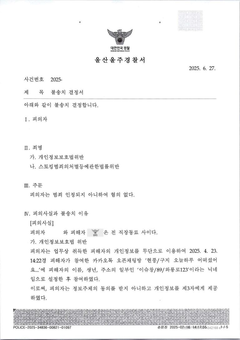 결국 경찰수사관은 본 변호인의 의견대로 범죄인정안됨을 사유로 적시하며 스토킹범죄와 개인정보보호법위반 혐의 모두 불송치(무혐의)로 잘 마무리 하였습니다.