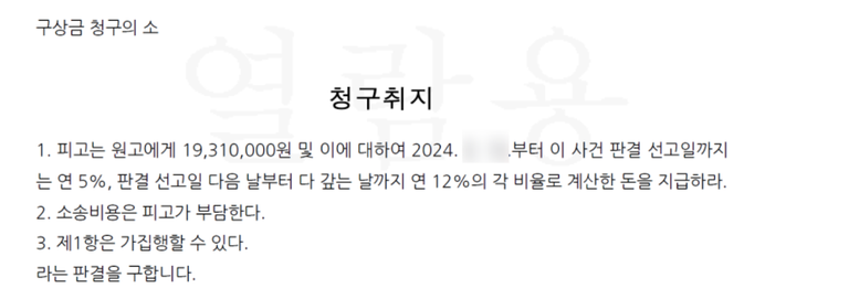 원고가 청구한 구상금 전액을 기한내로 피고가 지급하라고 하면서 지급기일이 지나면 지연손해금이 붙는 내용입니다.(소송비용은 각자 부담한다)