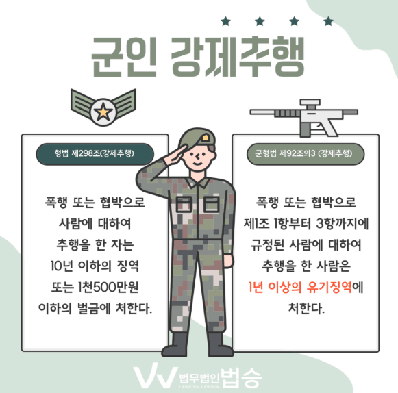 형법상 강제추행 혐의는 10년 이하의 징역 또는 1500만원 이하의 벌금형으로 처벌을 하고 있지만, 군 형법상 강제추행은 1년 이상의 징역으로 벌금형 없이 처벌을 하고 있습니다.