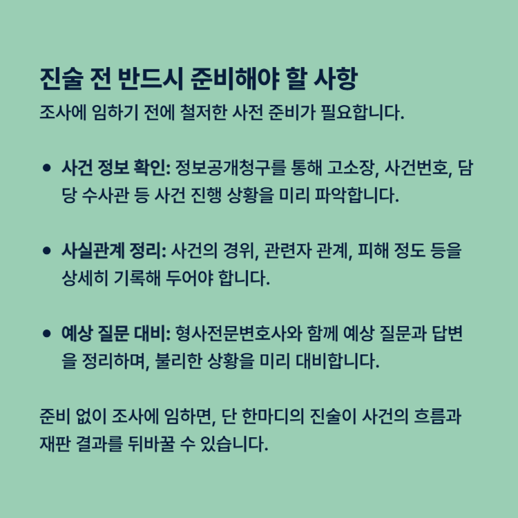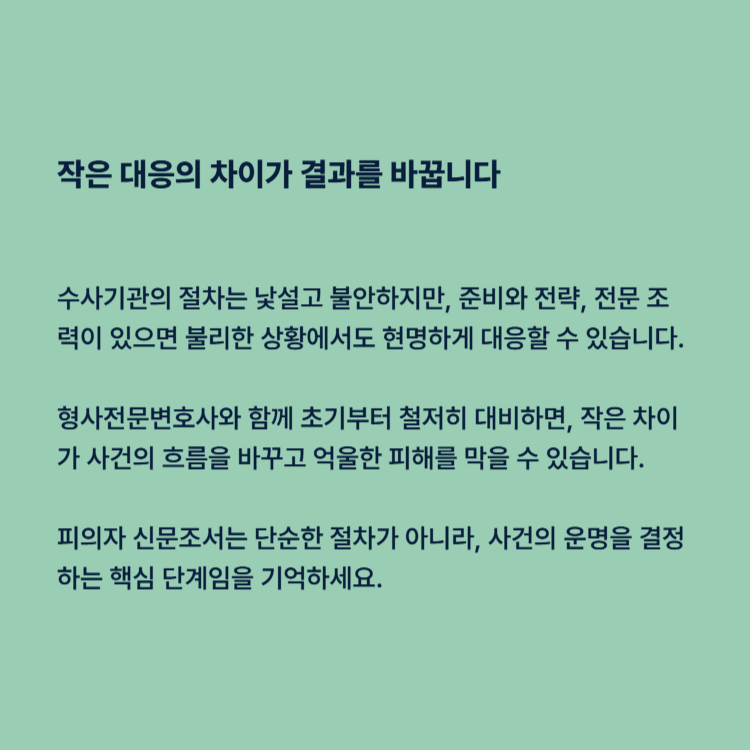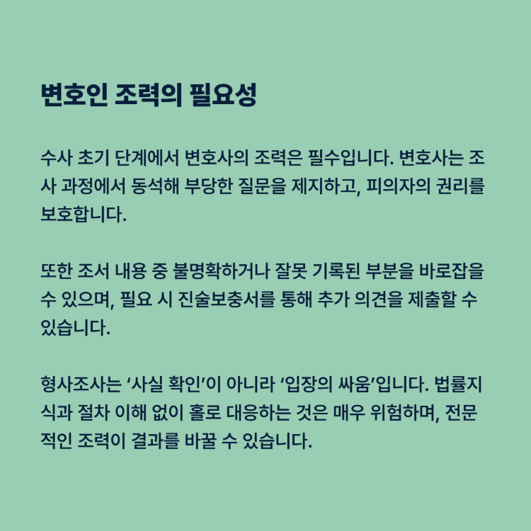 형사조사는 ‘사실 확인’이 아니라 ‘입장의 싸움’입니다. 법률지식과 절차 이해 없이 홀로 대응하는 것은 매우 위험하며, 전문적인 조력이 결과를 바꿀 수 있습니다.