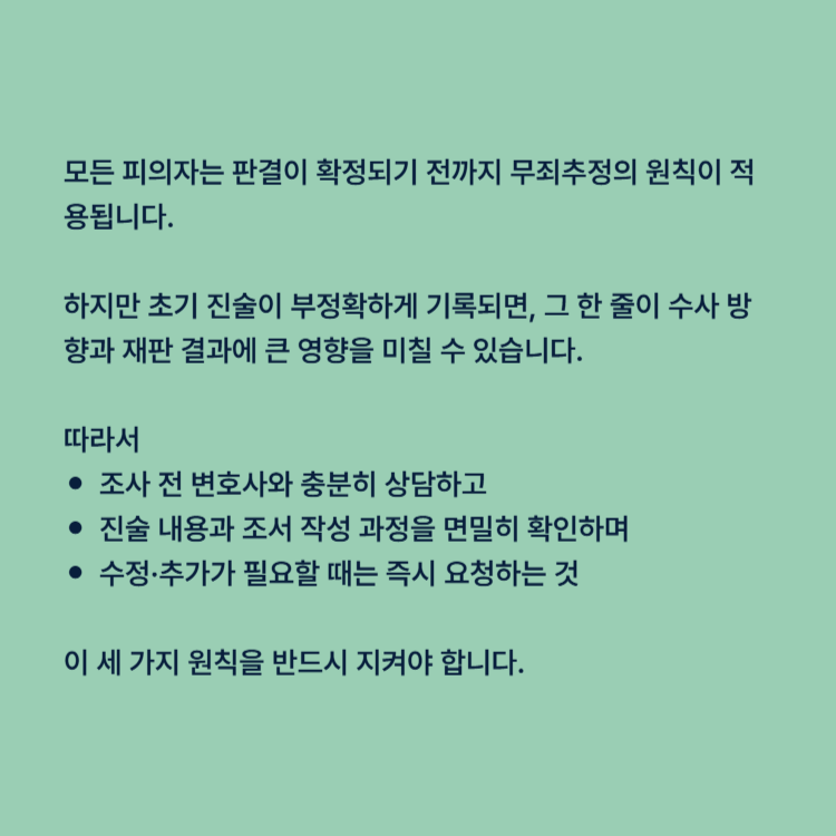 모든 피의자는 판결이 확정되기 전까지 무죄추정의 원칙이 적용됩니다. 하지만 초기 진술이 부정확하게 기록되면, 그 한 줄이 수사 방향과 재판 결과에 큰 영향을 미칠 수 있습니다.