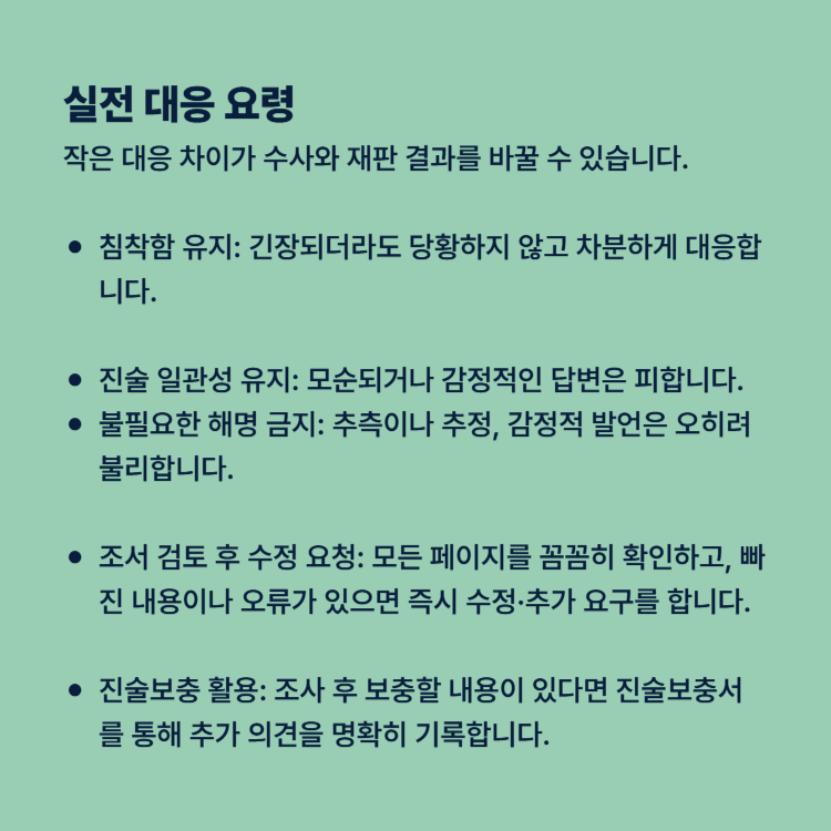 불필요한 해명 금지: 추측이나 추정, 감정적 발언은 오히려 불리합니다.