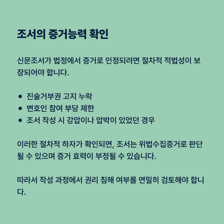 이러한 절차적 하자가 확인되면, 조서는 위법수집증거로 판단될 수 있으며 증거 효력이 부정될 수 있습니다. 따라서 작성 과정에서 권리 침해 여부를 면밀히 검토해야 합니다.