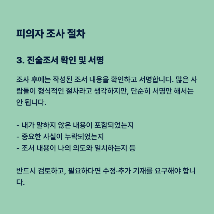 조사 후에는 작성된 조서 내용을 확인하고 서명합니다. 많은 사람들이 형식적인 절차라고 생각하지만, 단순히 서명만 해서는 안 됩니다.