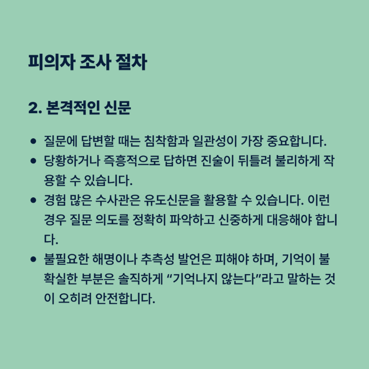 - 경험 많은 수사관은 유도신문을 활용할 수 있습니다. 이런 경우 질문 의도를 정확히 파악하고 신중하게 대응해야 합니다.