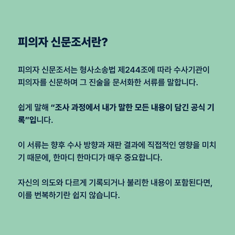 이 서류는 향후 수사 방향과 재판 결과에 직접적인 영향을 미치기 때문에, 한마디 한마디가 매우 중요합니다. 자신의 의도와 다르게 기록되거나 불리한 내용이 포함된다면, 이를 번복하기란 쉽지 않습니다.