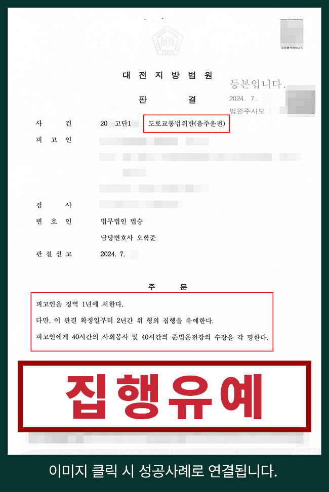 그 결과, 재판부는 징역 1년 및 집행유예 2년을 선고하며, 사회봉사 40시간과 준법운전강의 40시간 수강을 명령했습니다. 실형 위기에서 집행유예로 벗어나게 된 것입니다.
