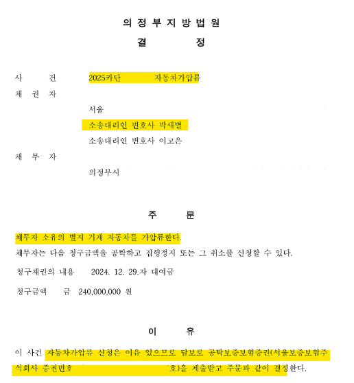 지급명령결정이 확정되기까지 시간이 걸리기에, 그 사이에 채무자가 재산을 처분하지 못하도록 자동차가압류를 신청함.